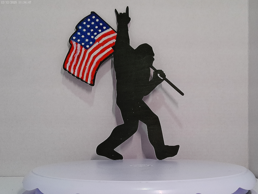 This one-of-a-kind wall decoration celebrates the majesty of nature and the enduring spirit of the United States. Showcasing the iconic Bigfoot silhouette proudly holding the stars and stripes, it's a captivating piece that will instantly elevate your décor. Perfect for the patriot, the outdoors enthusiast, or anyone who appreciates high-quality, handcrafted art.